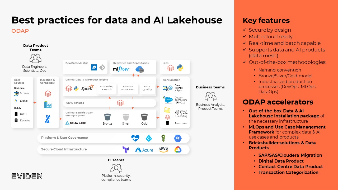 Unsere Expertinnen und Experten von Eviden und DataSentics begleiten Sie auf Ihrem Weg zu automatisiertem und KI-gestützten Datenmanagement. Mit der Data Intelligence Plattform mit Databricks werden Daten zentral im Data Lakehouse gespeichert und bilden eine ideale Basis für die Automatisierung und Vereinfachung von Prozessen. Für mehr Geschäftserfolg durch KI im Data Lakehouse. Erfahren Sie mehr über die Möglichkeiten mit Databricks und Best Practices für Data und AI Lakehouse!